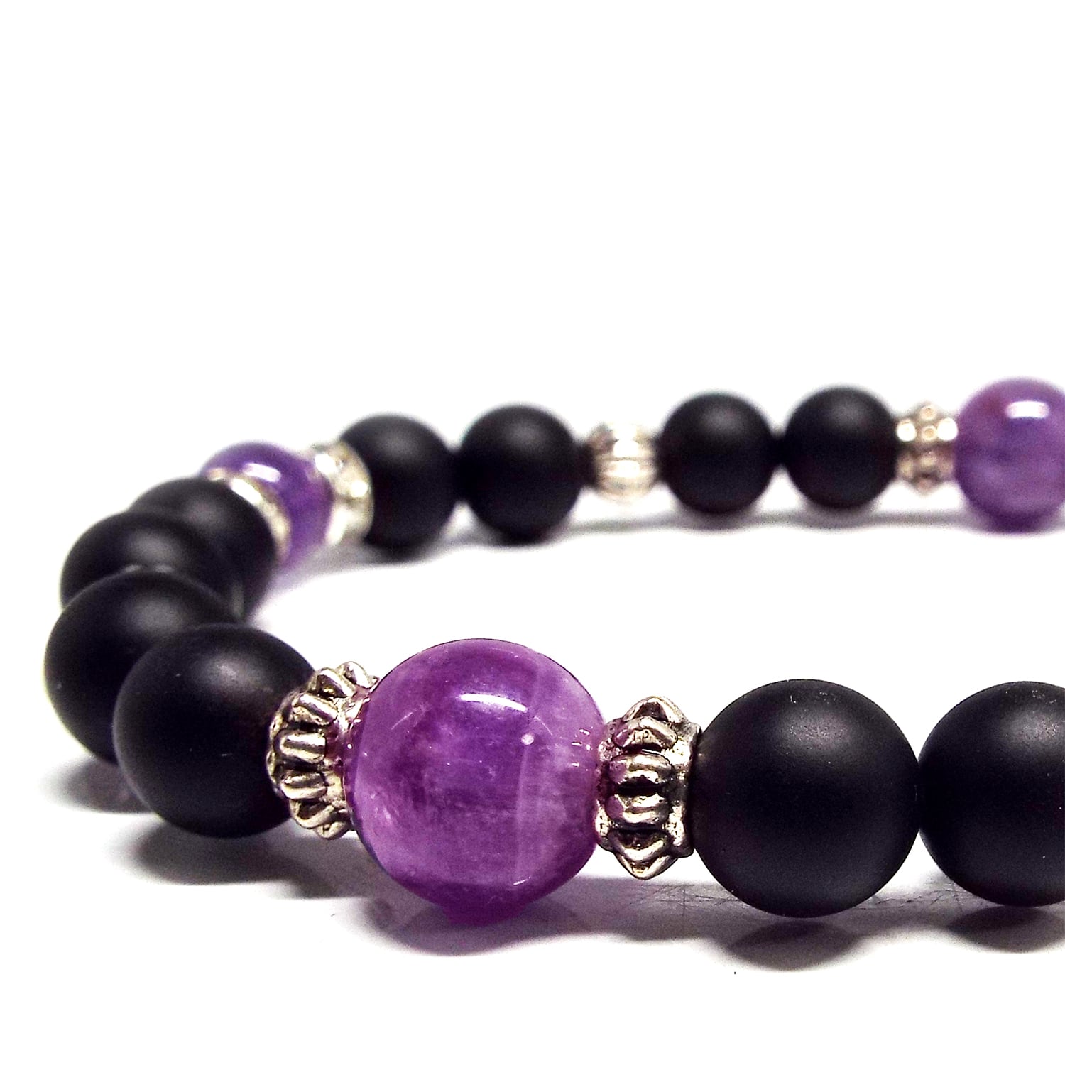 鮮やかなアメジストに相性の良いマットオニキスをあしらい、石が際立つブレスレットに仕上がりました☆