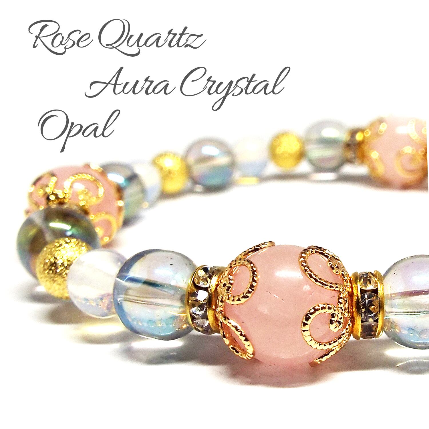 天然石 パワーストーン ブレスレット ローズクォーツ オパール オーラ水晶 D4-38